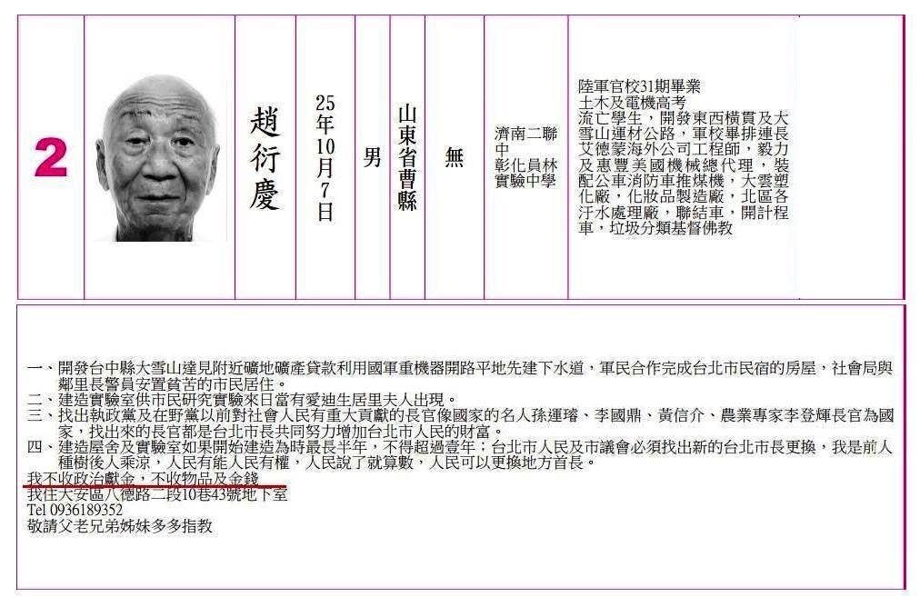 曾經在2014年拿出200萬選舉保證金、參選臺北市長的老兵趙衍慶,當時因為得票率未達10%,最後保證金被沒收。今(16)日傳出,趙衍慶已在2月份過世,告別式已經低調辦完,享耆壽91歲。