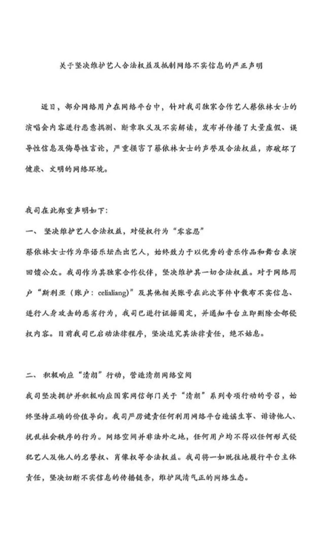蔡依林巡演官方微博發布的宣告指出,近日有部分網路用戶針對演唱會內容進行惡意揣測、斷章取義及不實解讀,發布並傳播大量虛假、誤導性訊息及侮辱性言論。宣告強調這些行為嚴重損害藝人的聲譽及權益,也破壞健康、文明的網路環境。