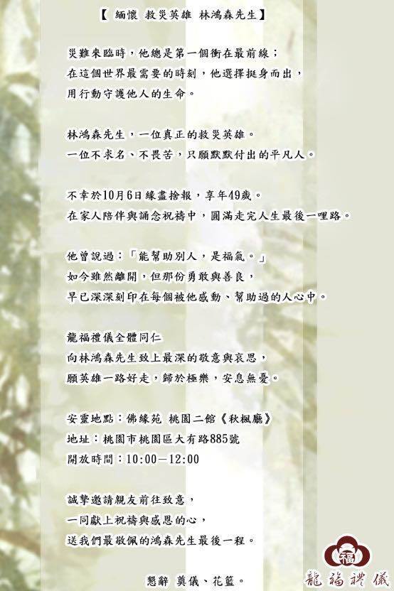 龍福禮儀在臉書發文指出,林鴻森在家人陪伴與誦念祝禱中,圓滿走完人生最後一哩路,他曾說過,「能幫助別人,是福氣」,在花蓮最需要幫助的時刻,他放下手邊的工作,載著山貓與挖土機進災區,奮戰八天。如今雖然離開,但那份勇敢與善良,早已深深刻印在每個被他感動、幫助過的人心中。