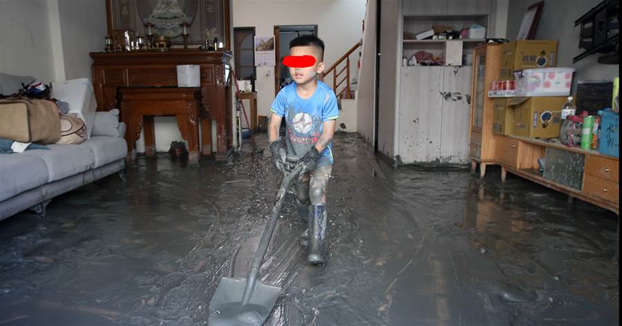花蓮馬太鞍溪堰塞湖溢流,造成光復鄉浩劫。圖為男童協助清理家中淤泥。(范揚光攝)