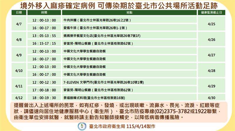 北市衛生局今宣佈新增1例麻疹境外移入確定病例,為10多歲外國籍男性。並公佈個案足跡。(圖/北市衛生局提供)