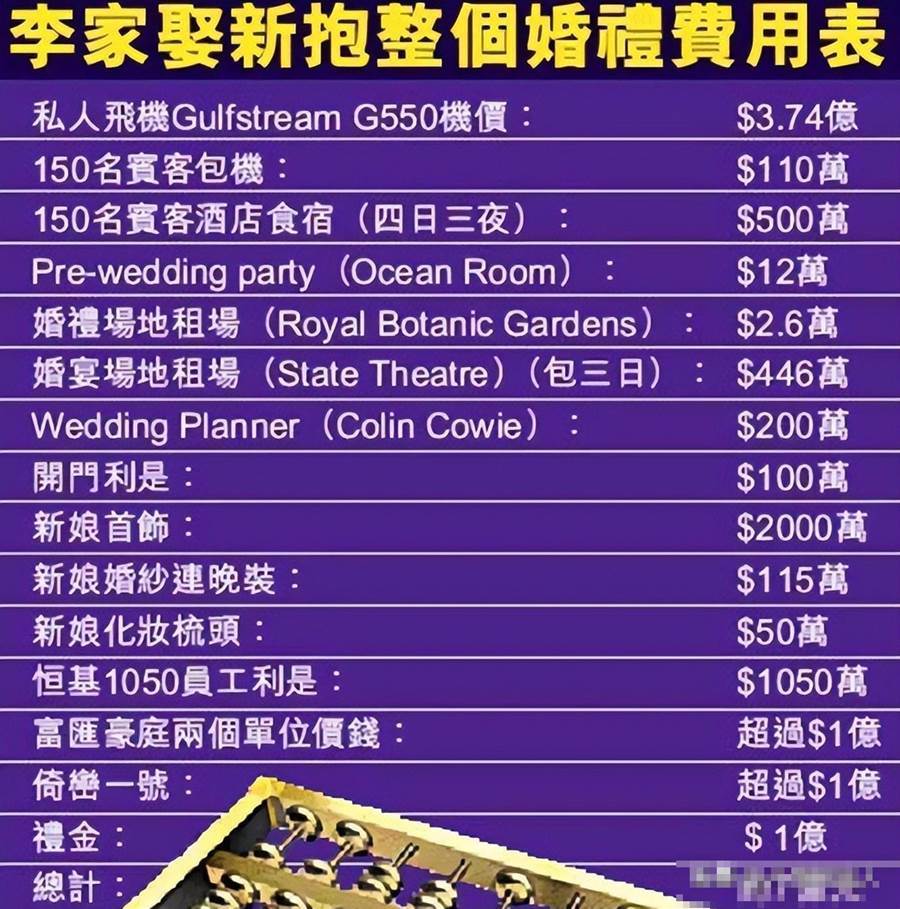 這場婚禮由李兆基親自主持,整個婚禮花費了7億港幣(約合人民幣6.16億元)。