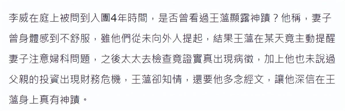 據臺媒報道,王薀過去自稱是活佛轉世,在精舍創立宗教廣招學徒,李威四年前退出演藝圈加入教會,他說原因是演藝圈五光十色的生活找不到平靜,然後妻子某天感覺到不舒服,從未向人提及,王薀竟主動提醒簡瑀家注意婦科問題,去醫院檢查竟查出病癥,然後李威父親因為投資失敗產生經濟危機,王薀居然也知情,讓他多唸經文。
