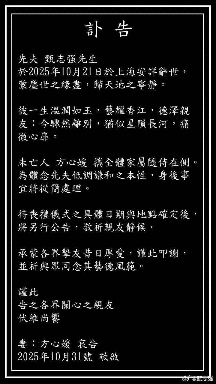 10月31日,香港演員甄志強的太太方心媛發訃文稱,甄志強已于2025年10月21日于上海安詳辭世,身后事宜將從簡處理。