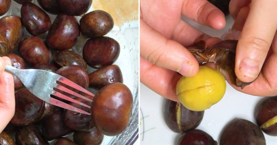 2.用叉子輕輕[插·入]板栗尾部,放在案板上,用刀切出一個長口子,方便板栗自動脫殼;