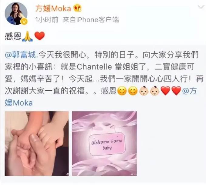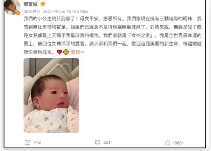 10月22日,港媒曝郭富城三胎出生,還拍到郭富城親自開車帶著岳父岳母去醫院接三寶。郭富城被拍時面帶笑容還感謝記者祝福,當時大家都覺得郭富城這麼開心,必定是追生兒子成功,沒想到稍后郭富城親自發文報喜,三胎居然是個女兒。