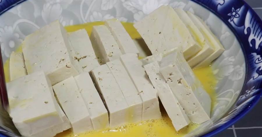 2、先把準備好的豆腐取出來,將它放到一個大碗中,然後在大碗中加入適量的清水,將豆腐清洗一遍,清洗完了之後把水倒掉,然後控幹豆腐表面的水分,接下來取出一把刀,將豆腐直接切成厚片就可以了,切完之後咱們先將它放到一旁,然後在小碗裡打入兩個雞蛋,並將雞蛋攪散。