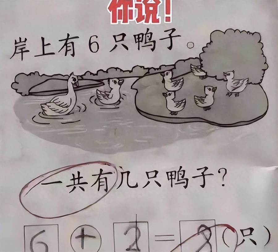 李女士是重點大學畢業,平時輔導上二年級的兒子寫作業,總覺得「小菜一碟」。直到看到兒子作業本上那道「岸上6只鴨子,水中2只,共幾只」的題目,她徹底懵了,兒子寫的「6+2=8」被畫了紅叉,旁邊還寫著「全班僅錯這一道」。