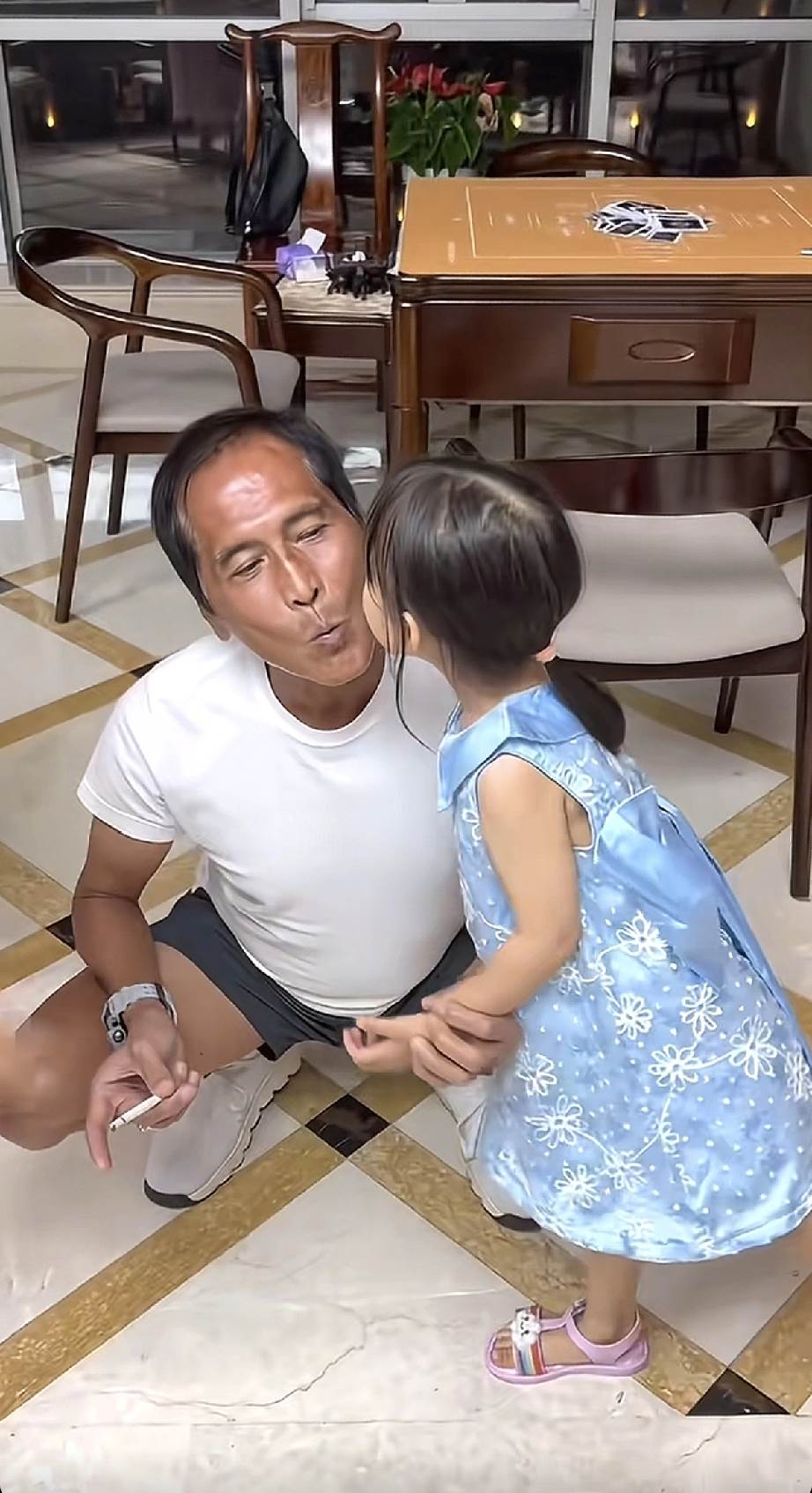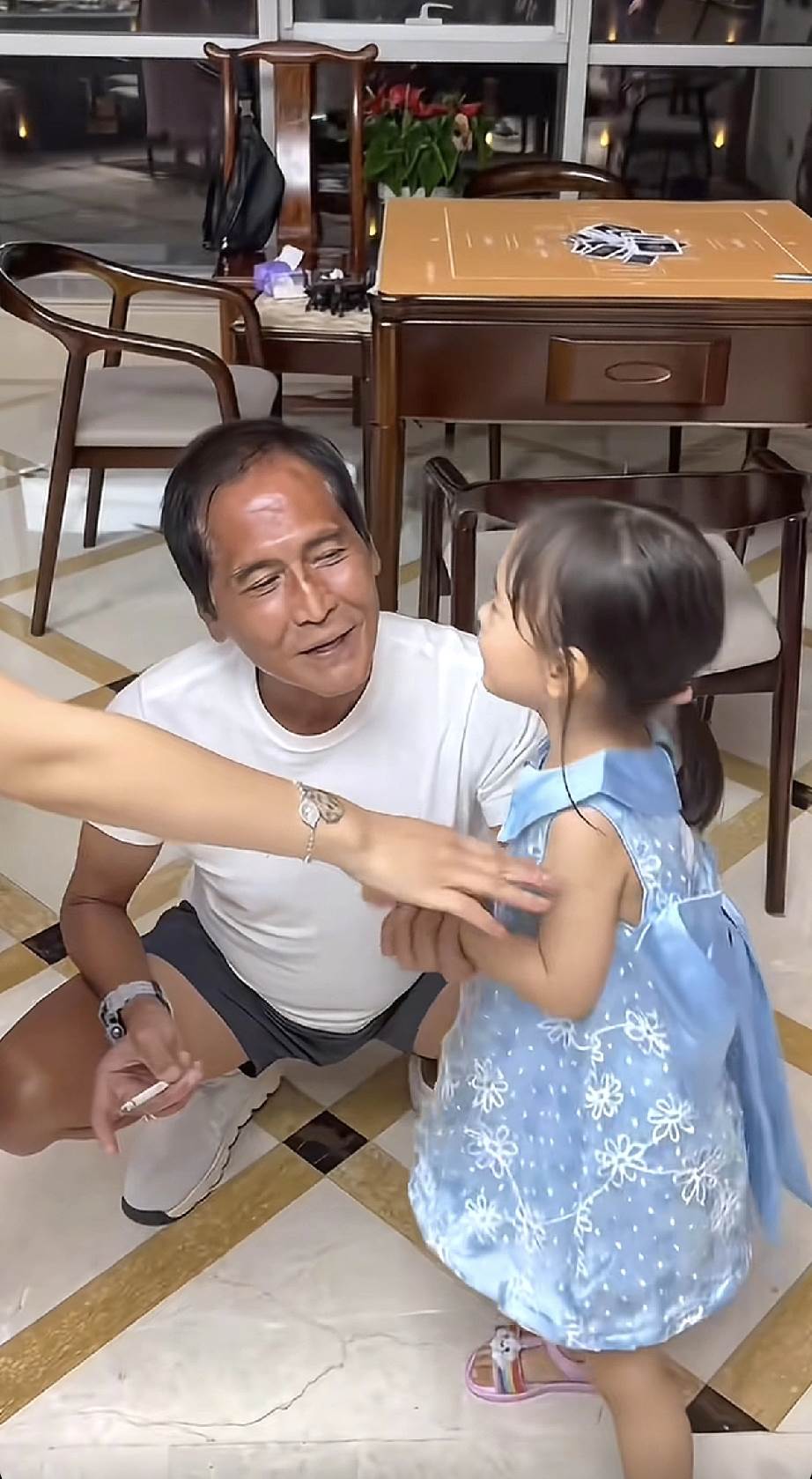男子頭髮花白,穿著簡單的白色T恤和卡其色短褲,面容慈祥,正與小女孩進行著某種遊戲互動。身旁,一位女士用手輕捂嘴巴,臉上是無法抑制的笑意。背景是裝修雅緻的現代客廳,大理石的瓷磚泛著光,一切都透著和睦的氛圍。