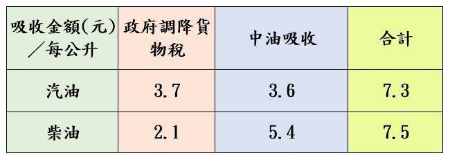中油表示,因應中東情勢變化且衡酌亞鄰國家油價補貼亦高之情形,為照顧國內民生與平穩物價,4月20日至4月26日中油持續吸收以維持亞鄰最低價,汽、柴油合計各吸收3.6元及5.4元,吸收幅度較上週略為縮小。