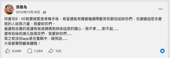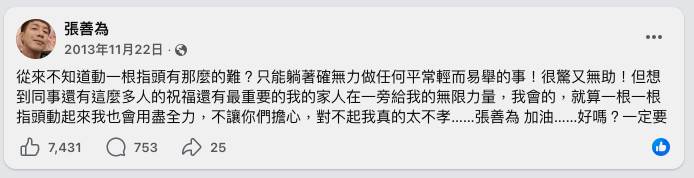 回顧2013年,張善為在個人臉書上親自發文訴說病況,字裡行間充滿無助:「從來不知道動一根指頭有那麼的難?只能躺著確無力做任何平常輕而易舉的事!很驚又無助!」他在文中感謝同事、粉絲及家人的支援,並向家人道歉「對不起我真的太不孝」,承諾會努力康復。貼文一齣,大批網友湧入留言為他加油打氣。
