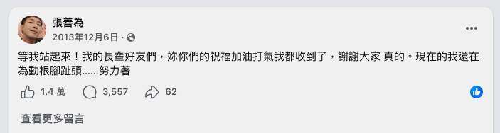 不久後,張善為留下最後一則訊息:「等我站起來!我的長輩好友們,妳你們的祝福加油打氣我都收到了,謝謝大家 真的。現在的我還在為動根腳趾頭……努力著!」此後便再無更新。