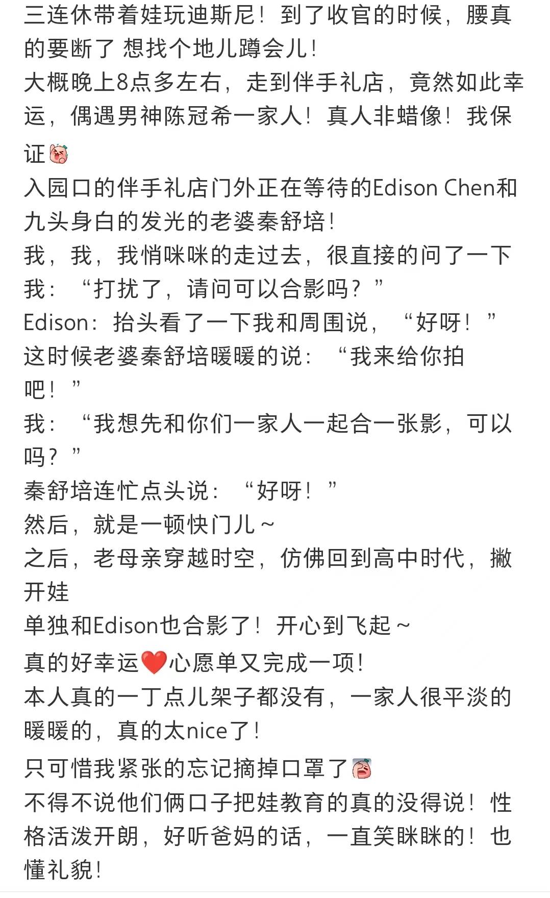 后面博主表示,希望可以兩家人一起合影,秦舒培也很爽快地答應。隨后,博主在文中稱贊,陳冠希一家人很nice,還夸陳冠希小女兒教育得好,性格開朗,又懂禮貌。
