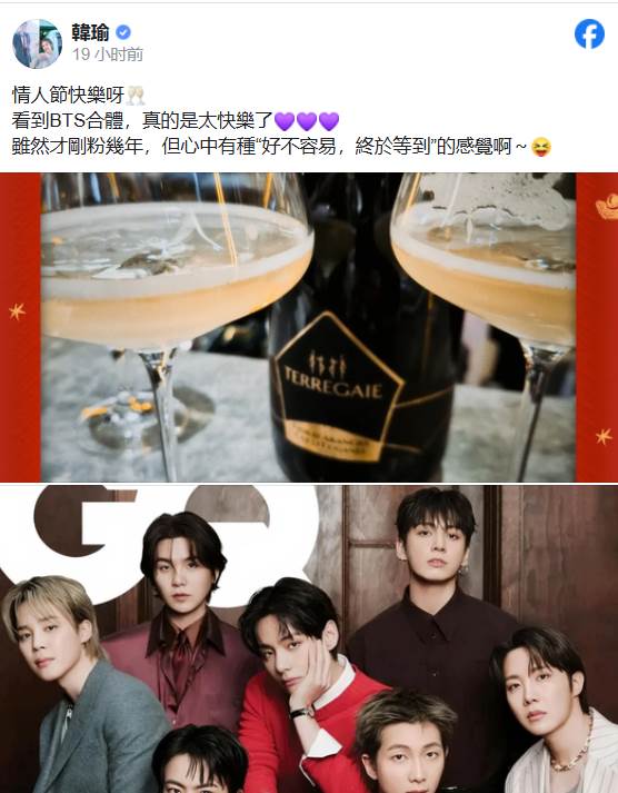 而韓瑜當晚則在社群寫下:「情人節快樂呀,看到BTS合體,真的是太快樂了,雖然才剛粉幾年,但心中有種『好不容易,終于等到』的感覺。