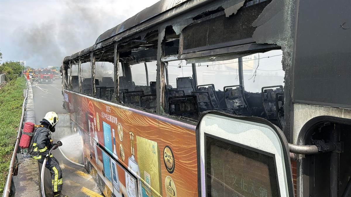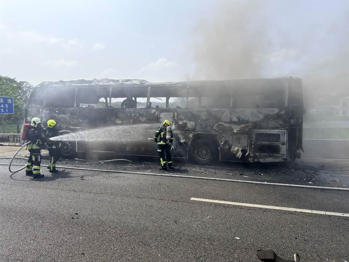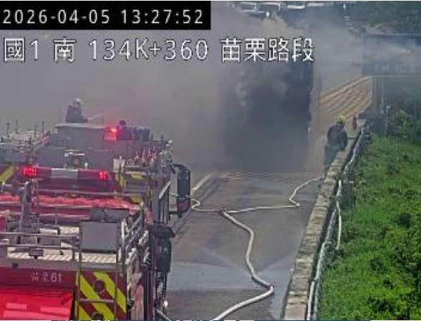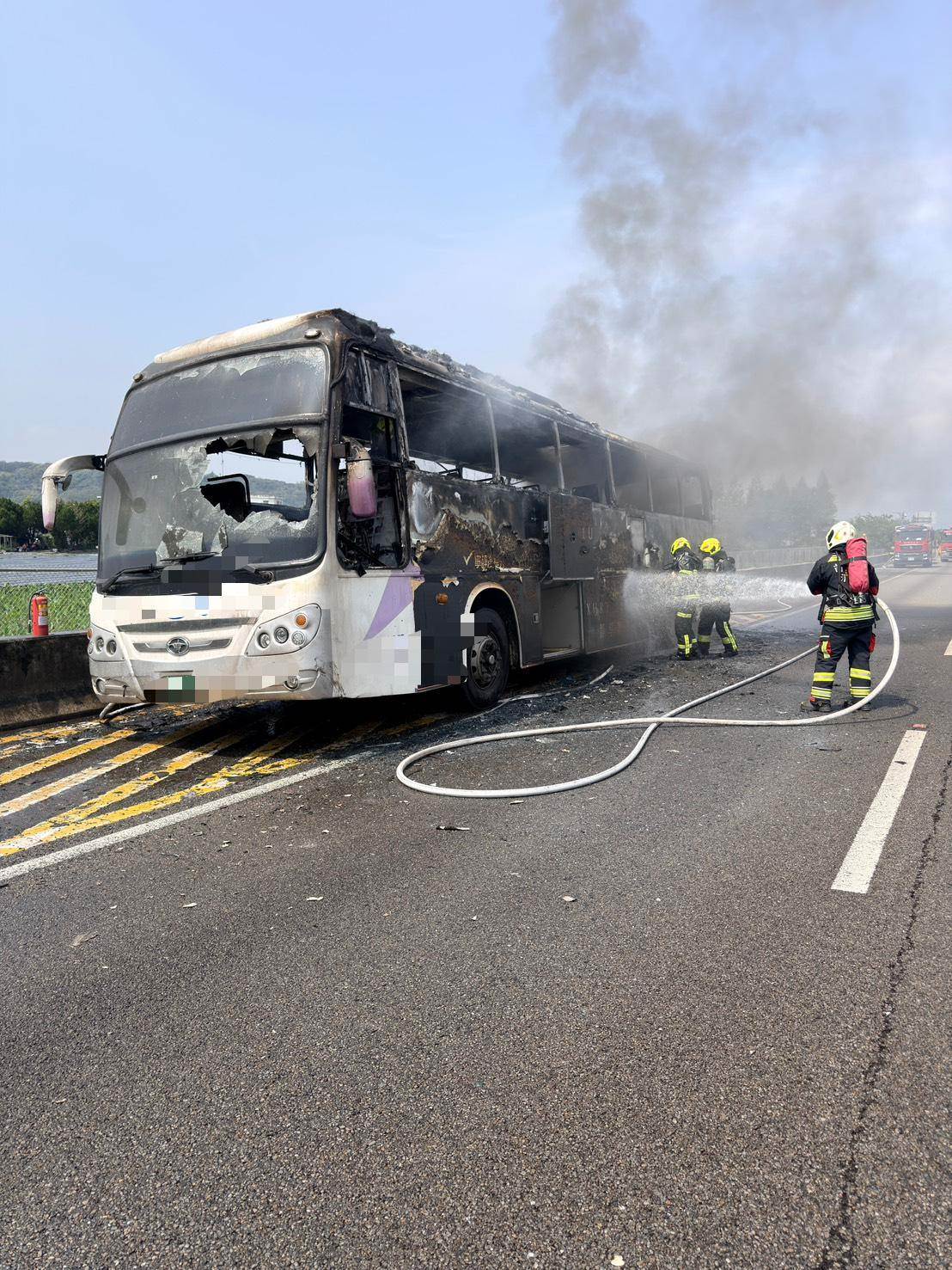 清明連假國道驚傳火燒車意外!今天(5日)下午1點6分左右,國道1號南向134.5公里苗栗路段,一輛國光客運大客車在行駛途中突然全面起火燃燒,整輛車瞬間陷入火海,最終被燒得只剩骨架,畫面相當駭人。