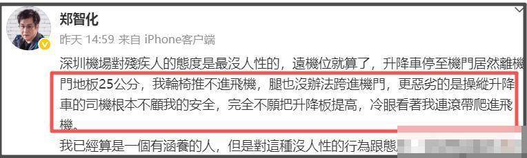 事件緣由很簡單,鄭智化登機遭遇升降板搭不上難題,無法乘坐輪椅登機,鄭智化形容是「冷眼看著我連滾帶爬進飛機」,狀況慘烈,于是大眾把矛頭對準了深圳機場及工作人員。