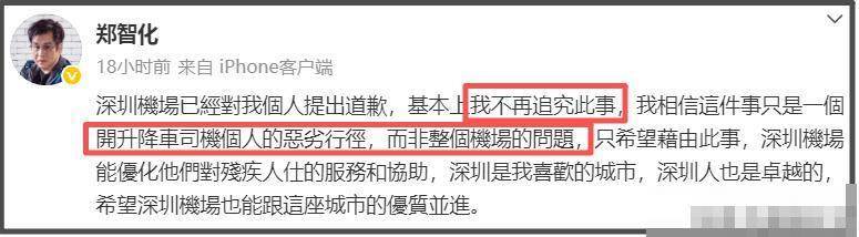 之后,鄭智化發文表示接受深圳機場的道歉,且不再追究此事,但又把矛頭對準開升降車的司機,斥其行徑惡劣。事實上,機場明文規定升降車與機艙門要有20公分的差距,司機只是例行公事,說明鄭智化這波發怒的對象錯了,可以說深圳機場無障礙設施不完備給鄭智化的出行造成了負面影響,但與司機無關。在深圳機場與鄭智化相繼回應之后,鄭智化的評論區淪陷了,熱評都是「沒有連滾帶爬」,誤導性太嚴重,給基層工作人員造成了困擾,應該給他們道歉。