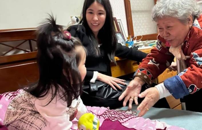另一張照片裡,奶奶的目光自始至終都停留在孫女與曾孫女身上,眼中盡是滿滿的愛與不捨。