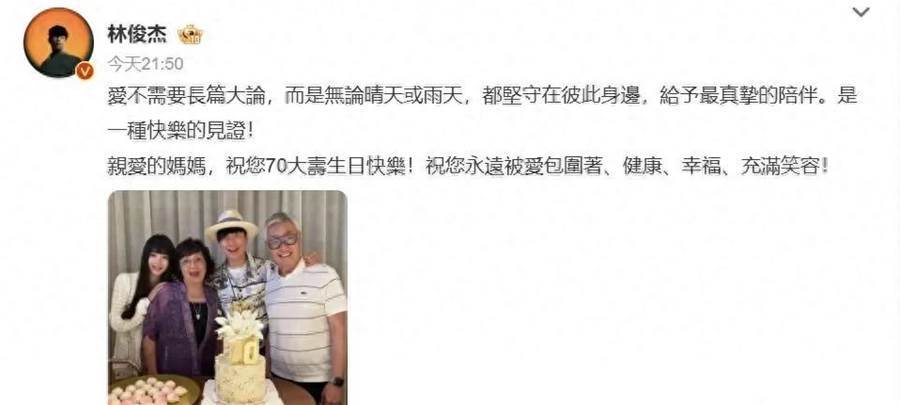 林俊杰出道這麼多年,首次官宣戀情,他借著為媽媽慶生的契機,曬出了自己與女友的合照,他的原話是「愛不需要長篇大論,而是無論晴天或雨天,都堅守在彼此身邊,給予最真摯的陪伴,是一種快樂的見證,親愛的媽媽,祝您70大壽生日快樂,祝您永遠被愛保衛者,健康,幸福,充滿笑容」,林俊杰的女友就是網紅七七,兩人年齡差了整整21歲。