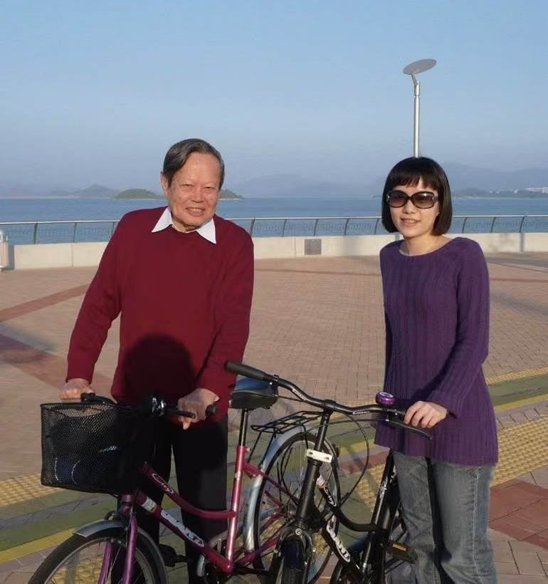 第六張,兩人在香港的合影,一起騎單車的場景,顯示了翁帆在照顧楊振寧的生活。