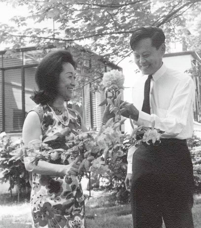 第一張照片中,杜致禮身著旗袍,在普林斯頓的住宅院子里摘花,她將一朵最漂亮的花送給楊振寧,楊振寧的笑容里滿是幸福。這張照片展現了兩人年輕時期的甜蜜與浪漫。