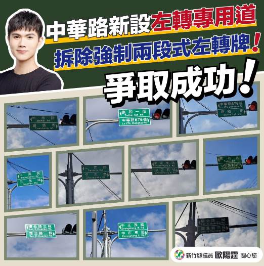 對此,新竹縣議員歐陽霆指出,他在過去3年爭取讓竹北市區內的兩線道道路取消「禁行機車」,並配合設置附加式左轉車道,如今中華路省道路段,機車將不再被強制要求待轉!