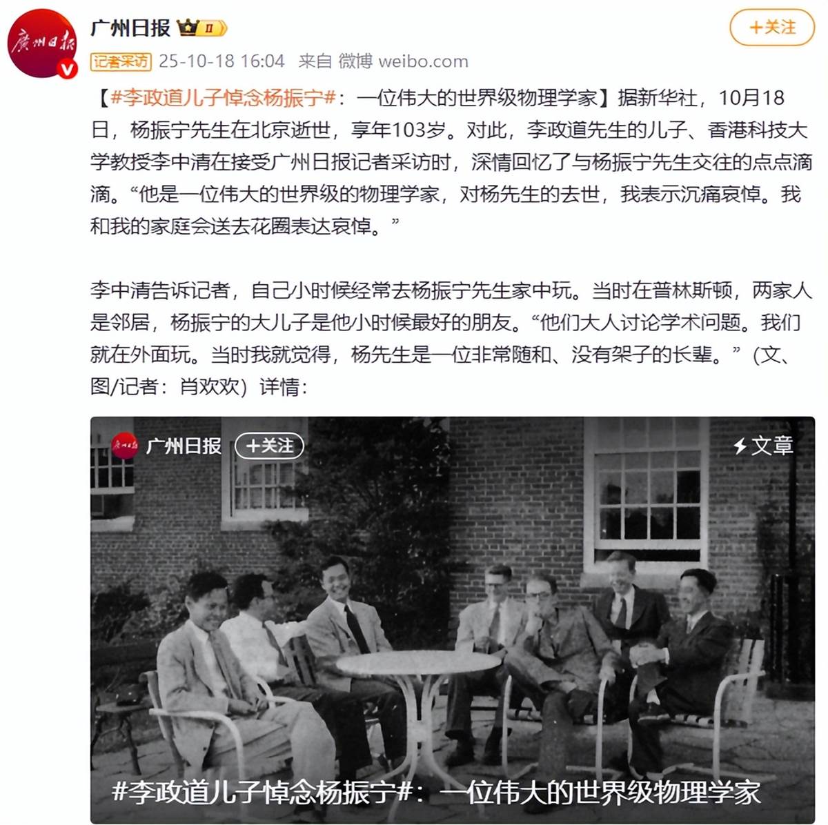 此外,當初和楊振寧一起獲諾獎的李政道先生的兒子也在接受采訪時表示沉痛哀悼。