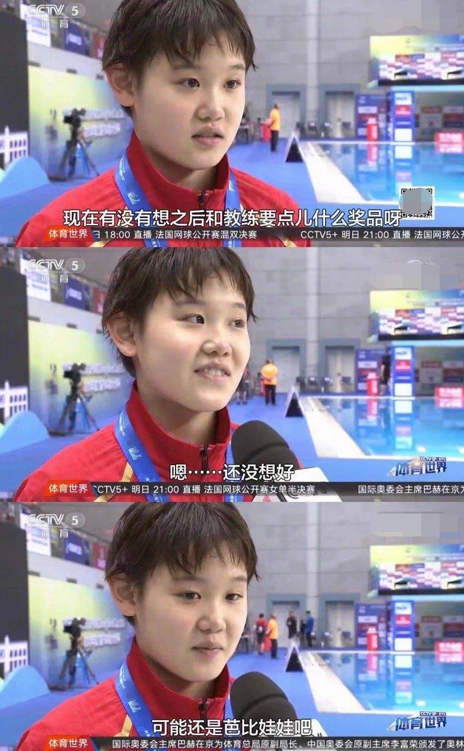 第一次參加奧運會就奪得冠軍后,17歲的張家齊接受媒體采訪時對著鏡頭喊話自己的教練,表示自己的奪冠禮物想要一個芭比娃娃,童趣呆萌的模樣吸引了一大批「姐姐粉」、「媽媽粉」。