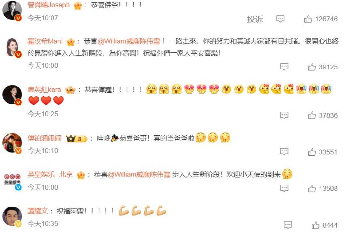 就連陳偉霆的經紀公司英皇娛樂業在留言區祝福這對新人,以及歡迎孩子的到來。
