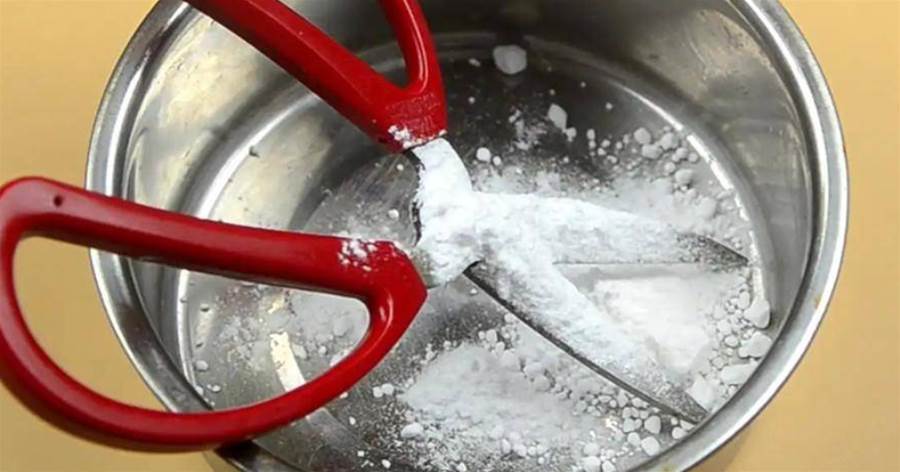 將它撒在剪刀的表面上,讓剪刀的每一個面都能均勻地附上一層厚厚的小蘇打,這樣才能使剪刀每個生鏽的地方都能清除乾淨。