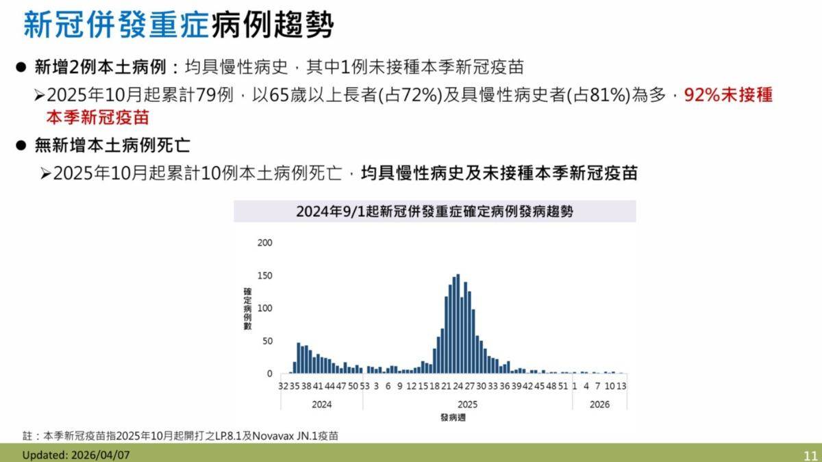 疾管署呼籲,新冠肺炎重癥患者以65歲以上長者及慢性病史者佔多數,且多未接種本季新冠疫苗。自今(7)日起,提供「65歲以上長者、55-64歲原住民、滿6個月以上且有免疫不全或免疫力低下患者」,可再增加接種1劑新冠疫苗,兩劑需間隔180天,提醒符合資格民眾應盡快施打,以提升保護力。