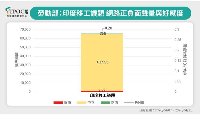 引進印度移工議題引發各界質疑,勞動部澄清,會從產業的人力需求、國人的關切與配套的完整等3方面,進行充分評估與把關,不會躁進。但對執政黨來說,印度移工無疑已成近期最具「殺傷力」之一的爭議話題,其中主管機關勞動部負面聲量更是遠高于正面聲量,好感度僅0.28。