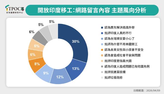 台灣及印度前年簽署勞工合作備忘錄(MOU),勞動部長洪申翰9日在立法院公開表示今年有機會引進,引發社會疑慮治安及管理問題,目前已有超過3.7萬人網路連署建請中止引進印度移工。TPOC台灣議題研究中心最新資料顯示,網路留言主題風向聲量佔比最高的是「呼籲政府應優先解決失聯移工問題」,高達3成,其次則涉及「性別安全」及「印度刻板印象」相關議題。