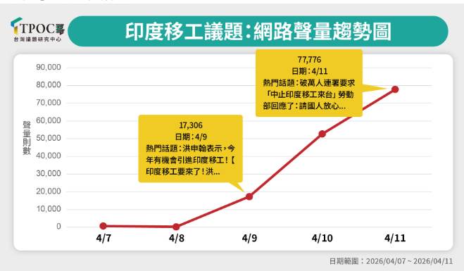 根據TPOC台灣議題研究中心透過QuickseeK快析輿情資料庫調查,自洪申翰于4月9日在立法院答詢時透露,今年將有機會引進印度移工,隨即使「印度移工」的議題聲量大爆發,一口氣衝破單日1.