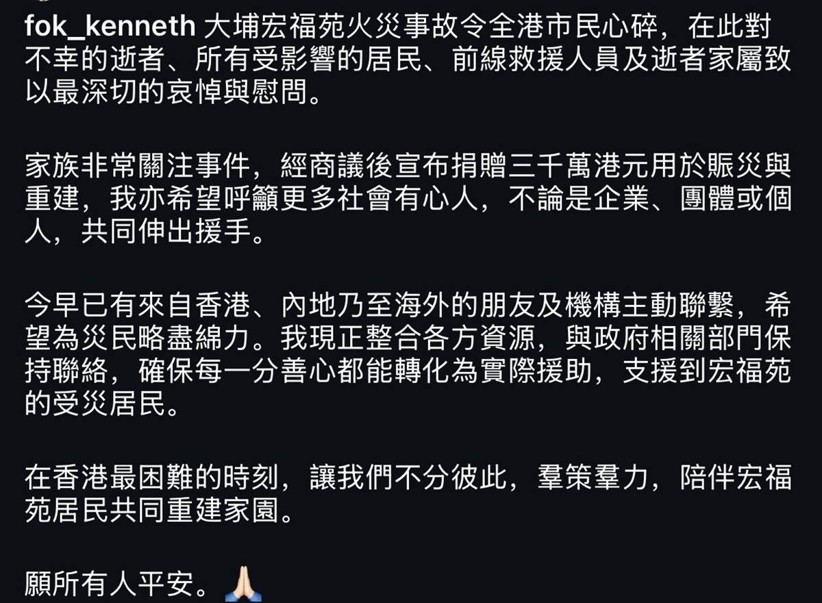 香港大埔宏福苑發生五級火災,牽連甚廣,面對嚴重火災,香港各界有錢出錢,有力出力,眾志成城,為救災貢獻一份綿力。在災情面前,香港富商們也都發揮出救援精神,不少本港大企業都宣佈捐款為受災的人員提供援助基金,以香港四大家族為例,他們所屬的企業都捐出了善款,其中李嘉誠、李兆基相關的基金會各自捐出了3000萬,而霍英東家族基金會也捐出了3000萬。除了大企業之外,不少娛樂圈的名人,也以個人身份捐出善款,令人倍感溫暖。