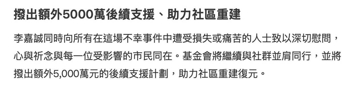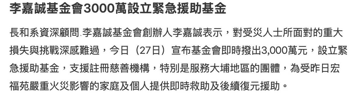 而此次在災情發生後及時撥發了3000萬元,設立了緊急救助基金,這些錢都是用于受宏福苑火災嚴重影響的家庭以及個人所用。李嘉誠還稱基金會也會向在執行任務中不幸遇難受傷的消防救援人員提供支援。除此之外,基金會還會額外撥出5000萬的後續支援計劃,助力社群重建,目前是香港富豪中捐資最多的一個。