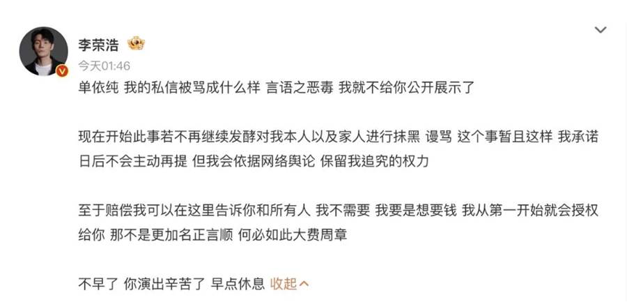 對此,單依純也發長文道歉,並表示侵權演唱一事,她將個人承擔全額版權使用費及賠償,不過李榮浩在今日凌晨回應,「單依純,我的私信被罵成什麼樣,言語之惡毒,我就不給你公開展示了」,接著強調:「至于賠償我可以在這裡告訴你和所有人,我不需要」,直言如果想要的是錢,一開始就會授權。