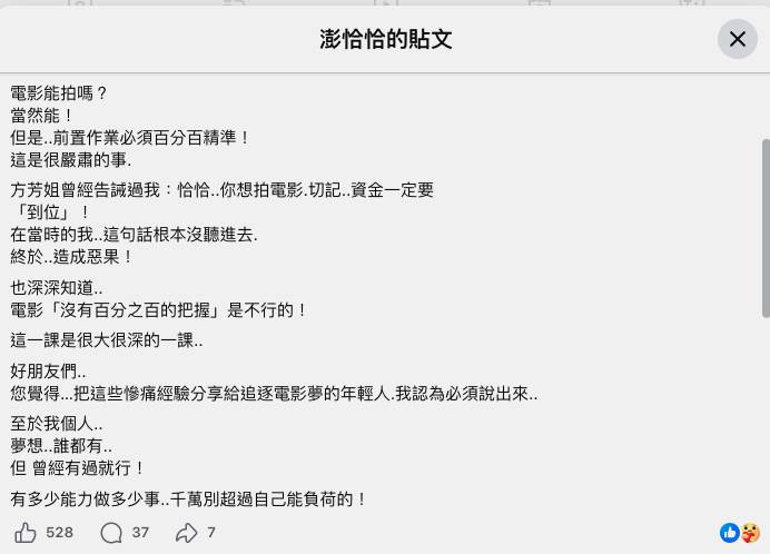 他認為有必要將自身經驗分享給同樣懷抱電影夢的年輕世代,感性寫下:「至于我個人,夢想誰都有,但曾經有過就行!有多少能力做多少事,千萬別超過自己能負荷的!」字裡行間充滿對後輩的誠摯提醒,直面自己的慘痛教訓,大方揭開自己的傷疤,希望大家能從他的失敗中學到寶貴一課,別重蹈覆轍。