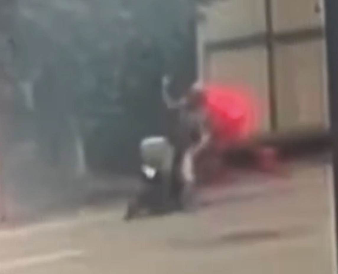 外送員疑似停車比出不雅手勢,接著連人帶車傾倒被輾過。(圖/民眾提供)