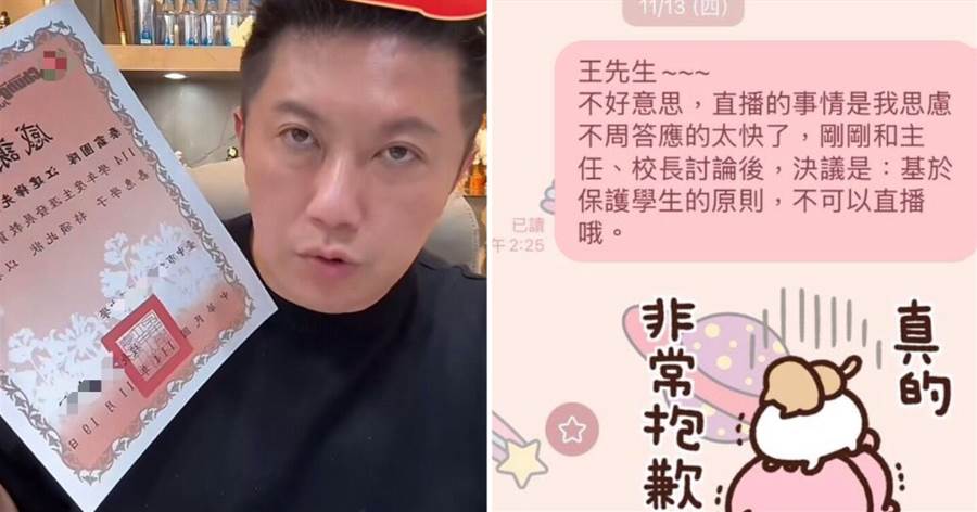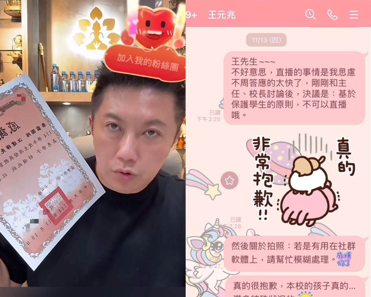 臺中某所國中19日邀請魔術師王元照演講,「神秘嘉賓」賓賓哥出席卻擅自直播,風波更驚動市長盧秀燕直批「白目」。校方昨晚拿出對話紀錄強調,13日就已提醒跟王元照,校內不得直播,至于賓賓哥所述感謝狀一事,是賓賓哥自行取走,校方已經報案提告。