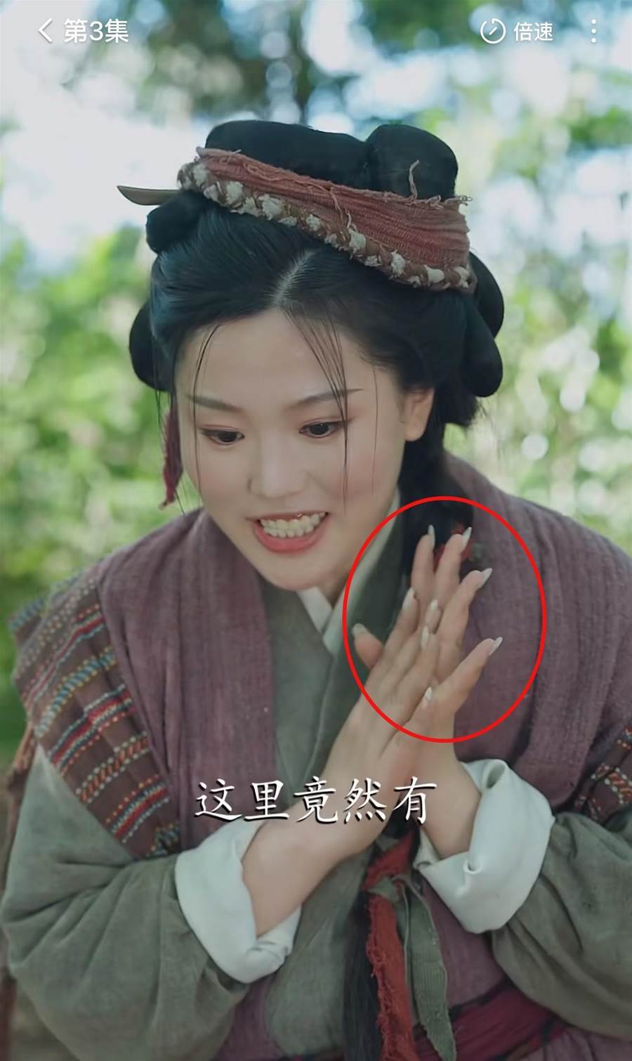 但鏡頭一轉,手上一幅現代感十足的美甲,看得人十分出戲。