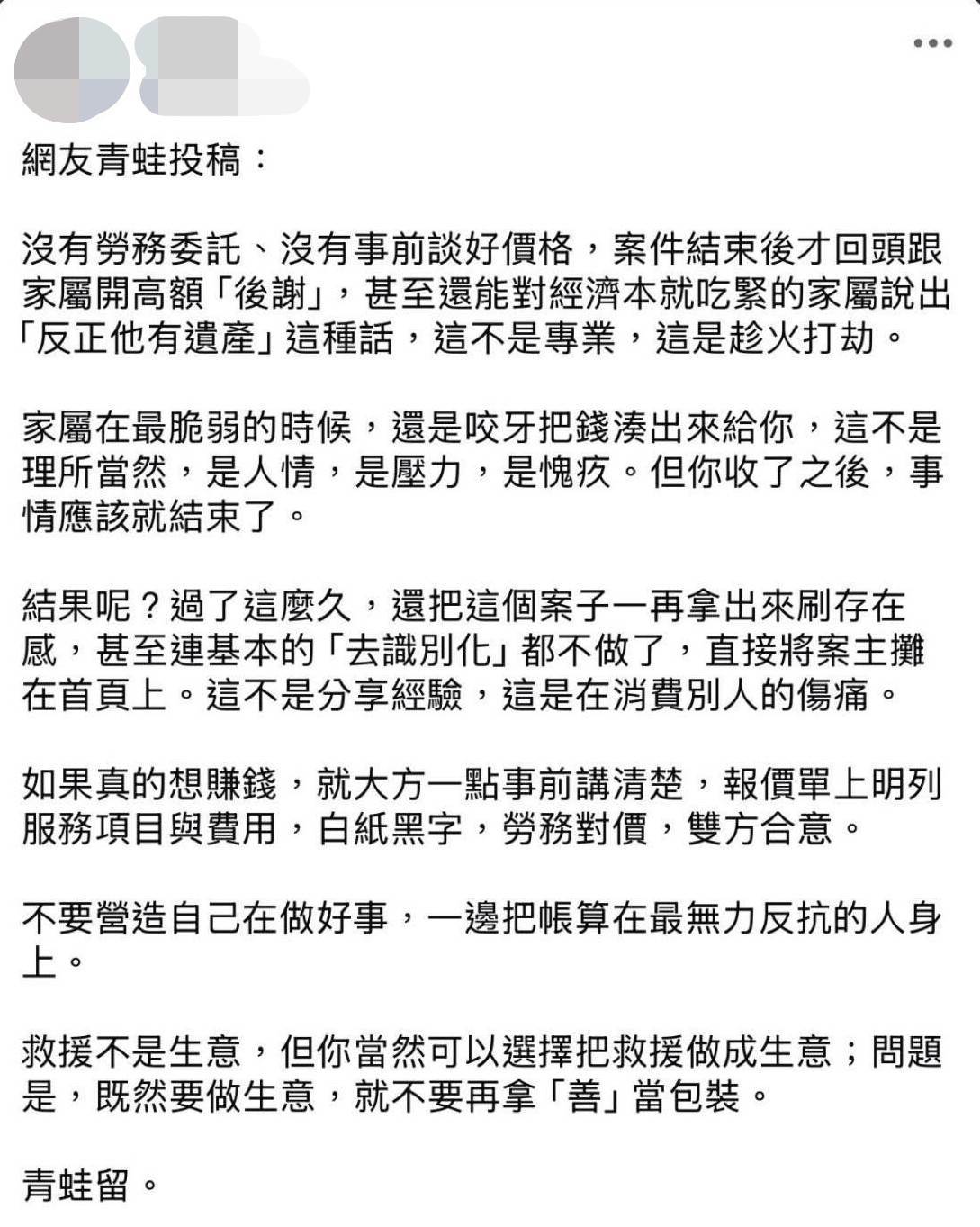 協助牽線的蔡姓女山友指出,當初是她主動聯繫跑山獸協尋,對方先自行搜尋數日未果,才表達若要持續投入,希望能給予心意酬勞,並強調金額可依家屬能力衡量。最終在她建議下,家屬決定給付10萬元,並于尋獲遺體後匯款,此說法與「事後臨時開價」的指控,呈現不同版本。