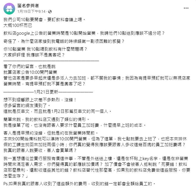 據《CTWANT》報導,原PO在臉書「匿名公社」表示,公司10點要開會,決定要訂飲料在會議上喝,大概100杯,由于店家公告的營業時間是早上10點,所以便要求店家在10點送到公司,「應該不過分吧?」