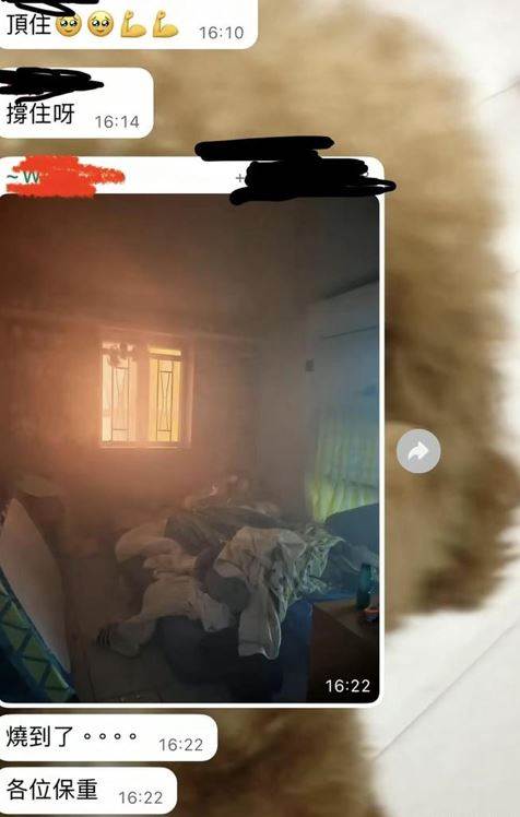 香港大火發生後,微博和Threads上瘋傳一張對話截圖,看到有一名居民受困在房間,屋內濃煙密佈,窗外還能看到橘紅色的大火逐漸朝他逼近,讓他當下非常絕望,即使朋友不斷鼓勵說「撐住呀!」他仍拍下當時情景,並在群組向眾人告別。