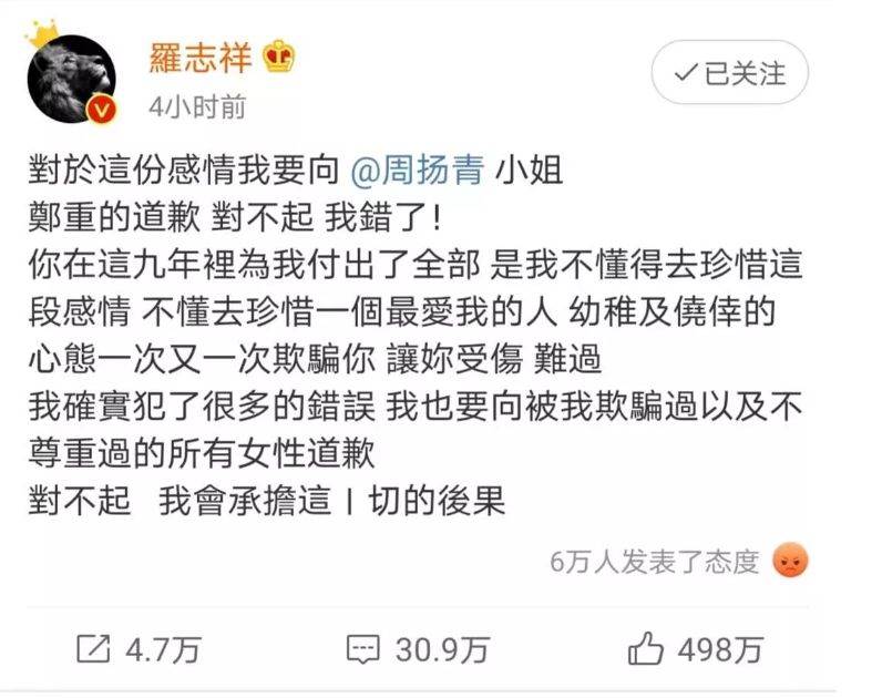 2020年4月23日,周揚青爆料羅志祥多次劈腿,與多人有不正當的男女關系。隨後,羅志祥發文道歉。