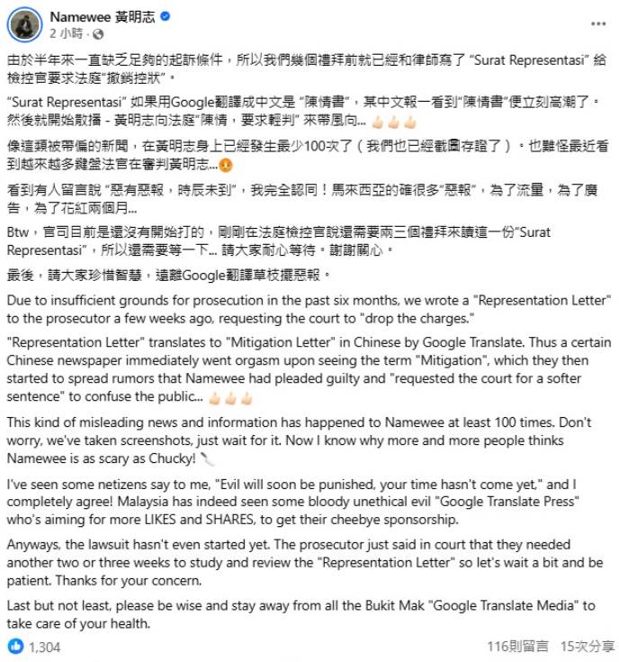 黃明志8日在臉書貼文中特別澄清,「Surat Representasi」若用Google翻譯成中文是「陳情書」,但部分中文媒體看到後便開始散播「黃明志向法庭陳情,要求輕判」的訊息。他對此表達強烈不滿,表示「像這類被帶偏的新聞,在黃明志身上已經發生最少100次了」,並已截圖存證。他無奈地說:「也難怪最近看到越來越多鍵盤法官在審判黃明志。