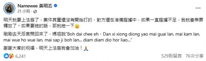 在開庭前一日,黃明志曾在臉書發文表示,案件其實還沒有開始打,對方還在準備證據中,若一直證據不足,他就會無罪釋放。