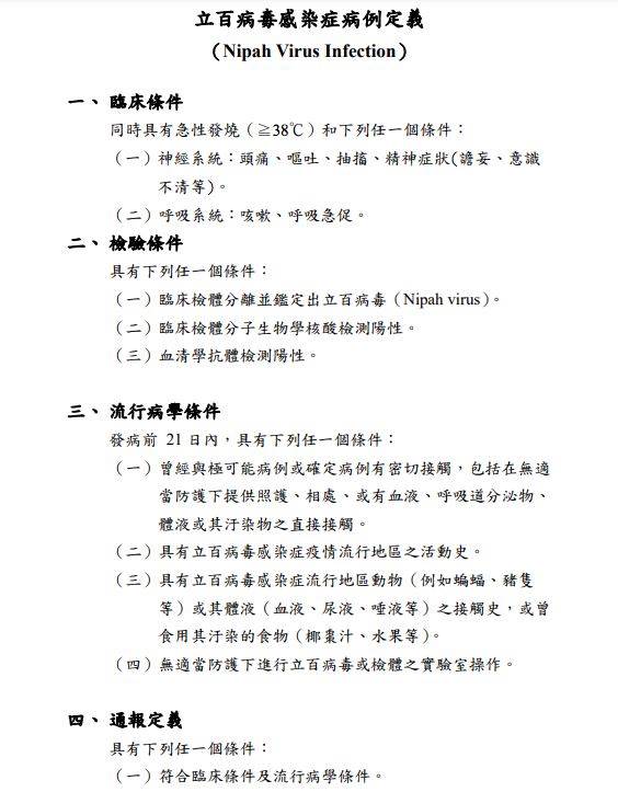 疾管署今日發佈致醫界通函,宣佈衛生福利部自115年4月2日公告新增立百病毒感染癥(Nipah Virus Infection)為第五類法定傳染病,疾病管制署(下稱疾管署)依國際相關指引訂定病例定義,籲請醫師于臨床診治如發現符合通報定義之病例,應于24小時內至傳染病通報系統(NIDRS)通報,並依感染管制措施指引進行疑似病例採檢送驗及隔離治療。