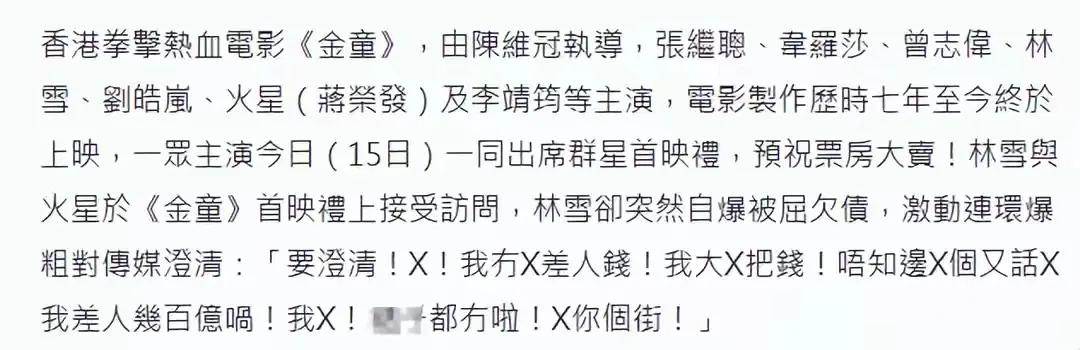 此番闢謠,林雪勃然大怒,對捏造事實的無中生有者,好一通怒斥咒罵,並堅決表示壓根沒有欠下賭債,也沒有破產,「自己有大把的錢」。