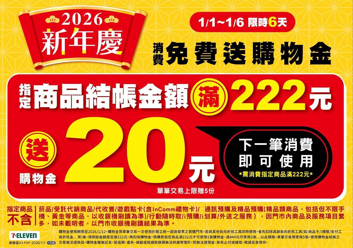 此外,為慶祝2026年到來,7-ELEVEN也推出新年慶優惠活動,2026年1月1日至1月6日,全店商品(菸、受託代銷、i預購、精品預購除外),每滿222元送20元購物金(單筆限贈5張),而此購物金可于2026年1月12日前于下一筆消費滿222元折抵20元(單筆限使用5張)。